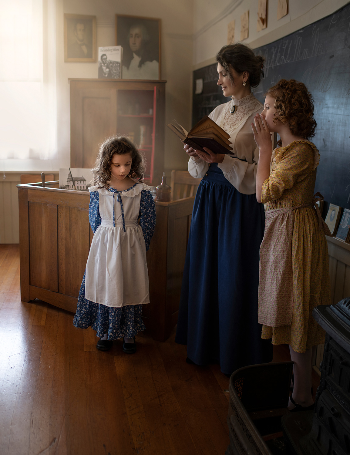 The majority of these early schools had a single teacher, pot-bellied stoves, and a wood pile. At the front of the classroom would be a large wooden blackboard mounted to the wall. Close to the teacher's desk would be a free-standing wood (or coal) stove giving off a cheery heat during the cold winter months.